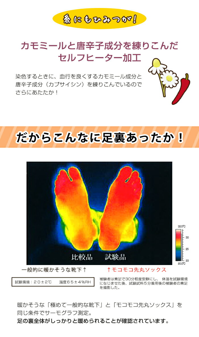 糸にカモミールと唐辛子成分が練りこまれているので、一般の靴 下とは段違いの暖かさです。